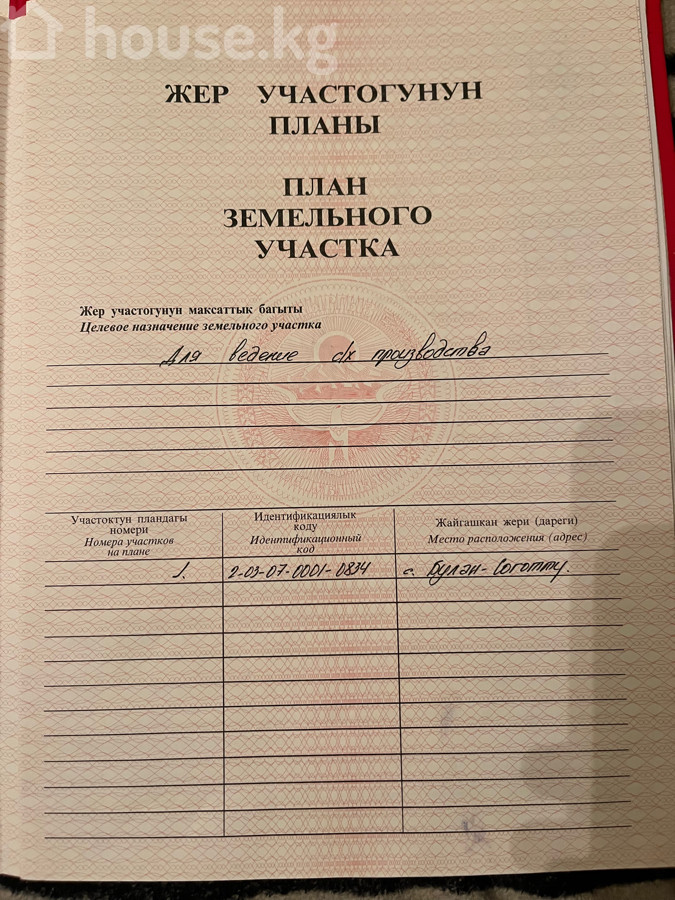 🏠 ПРОДАЕТСЯ ЗЕМЕЛЬНЫЙ УЧАСТОК (КЫРГЫЗСТАН) Локация: Иссык-Кульская область, с. Булан-Соготту (отличное курортное направление, рядом с северным берегом Иссык-Куля). 📋 ОСНОВНЫЕ ХАРАКТЕРИСТИКИ: • Площадь: 0,64 га (64 сотки). • Целевое назначение: Для ведения сельскохозяйственного производства (с/х производство). • Тип угодий: Сенокос (согласно экспликации земель). • Правовой статус: Частная собственность (Красная книга). • Идентификационный код: 2-03-07-0001-0834 🌟 ПРЕИМУЩЕСТВА: • Юридическая чистота: На руках полный пакет документов (Госакт/Красная книга). Запись внесена в реестр в 2009 году. • Перспективный район: Село Булан-Соготту известно своими пансионатами («Аврора», «Меридиан») и чистыми пляжами. • Инвестиционный потенциал: Участок большой площади (64 сотки) подходит как для агробизнеса, так и в качестве долгосрочной инвестиции. 💰 СТОИМОСТЬ: Если покупать общий участок то цена [120000] $ Если хотите по определений соток то цена за 1 соток - 3000$( торг уместен / возможен обмен). 📞 КОНТАКТЫ: Телефон: [0702139949] WhatsApp: [0702139949]