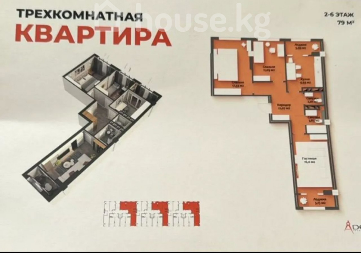 Продается 3 комнатная квартира ПСО Адрес: Жукеева -Пудовкина 43/12 СК: Ала Тоо Строй Сервис ЖК: Ала Тоо Квартира на 2, 4, 8 этажах Площадь: 79м2; не угловая; окна выходят на север и на юг. Отопление: газовое Парковка: имеется Материал стен: Кирпичный до 6 этажа, газоблок до 9 этажа Сдача ПСО 2 квартал 2026г