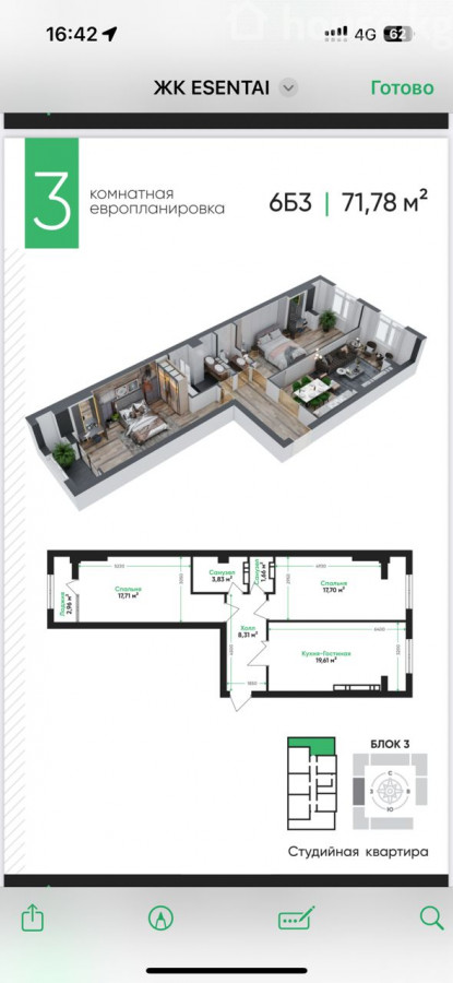 ЖК Esentai от Artwin 3 Блок сдан под ПСО 10 этаж из 12 71,78 м2 3-х студия ID: 84222