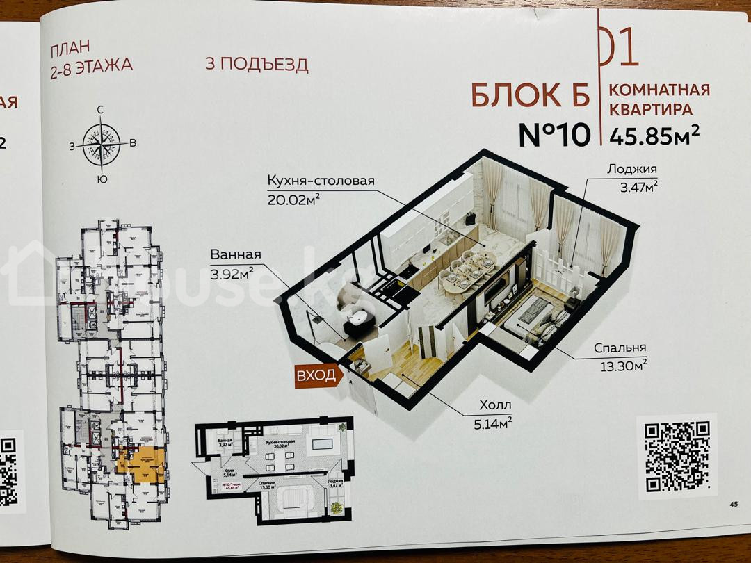 1-комнатная квартира в элитном ЖК «Салт» от СК «Левел Строй», район Дасмия (Анкара/7 Апреля — Горького/Алматинка). Рядом: Technopark ~500 м, гипермаркет Азия, остановки общественного транспорта. Площадь: 45,85 м² Этаж: 9 из 14 Дом: красивый фасад, просторный двор, парковка, детская площадка. Срок сдачи (ПСО): 4 квартал 2026 г. Документы: красная книга, ПДКП через ГРС.