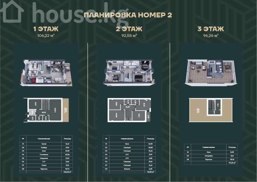 Таунхаусы в селе Байтик — за городом, тишина и свежий воздух рядом с горами. Скоро старт продаж. Стройка начинается в ближайшее время — успейте в первую волну бронирования. По вопросам и брони: WhatsApp + Планировка №1 - Общая функциональная схема на 3 этажа. - 1-й этаж (106,22 м²): - Кухня 14,61 м² - Тамбур 3,96 м² - Холл 16,93 м² - Гостиная 42,94 м² - Кладовая 3,40 м² - Санузел 3,46 м² - Топочная 5,61 м² - Терраса 15,70 м² - 2-й этаж (92,55 м²): - Холл 16,59 м² - Комната 15,88 м² - Комната 15,24 м² - Санузел 6,05 м² - Спальня 18,10 м² - Санузел 14,01 м² - Балкон 4,29 м² - 3-й этаж (87,04 м²): - Холл 16,39 м² - Комната 18,88 м² - Комната 15,24 м² - Кладовая 3,79 м² - Терраса/лоджия 4,26 м² Планировка №2 - Альтернативное зонирование с увеличенной террасой на 3-м этаже. - 1-й этаж (106,22 м²): - Кухня 14,61 м² - Тамбур 3,96 м² - Холл 16,93 м² - Гостиная 42,94 м² - Кладовая 3,40 м² - Санузел 3,46 м² - Топочная 5,61 м² - Терраса 15,70 м² - 2-й этаж (92,55 м²): - Холл 16,59 м² - Комната 15,88 м² - Комната 15,24 м² - Санузел 6,05 м² - Спальня 18,10 м² - Санузел 14,01 м² - Балкон 4,29 м² - 3-й этаж (96,26 м²): - Холл 5,89 м² - Кладовая 5,61 м² - Открытая терраса 73,76 м² Особенности - Два полноценных жилых уровня + эксплуатируемый третий этаж. - Просторная гостиная-столовая, отдельная кухня, два санузла на втором уровне. - Наличие кладовых, топочной, балконов и больших террас. - Вариант №2 предлагает увеличенную террасу на третьем этаже для зоны отдыха на открытом воздухе.