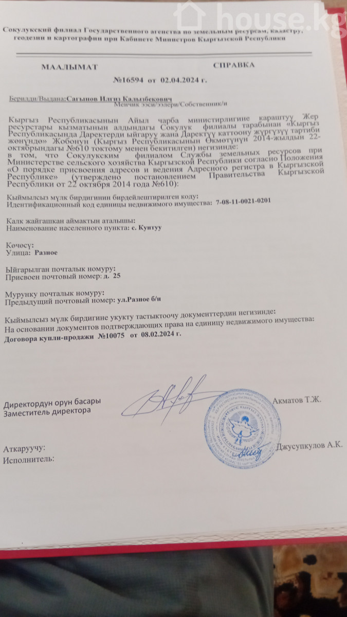 обл. Чуй, р-н Сокулукский, а/а Кун-Тууский, с. Кунтуу, ул. Разное, д. 26. обл. Чуй, р-н Сокулукский, а/а Кун-Тууский, с. Кунтуу, ул. Разное, д. 26.