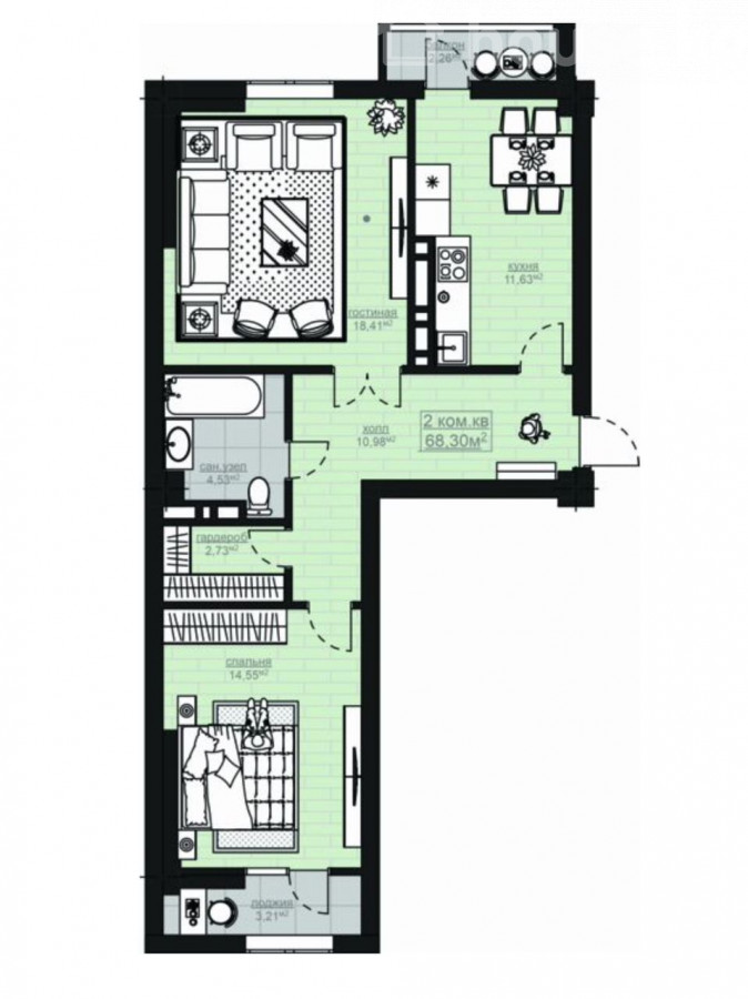 2-комн. кв., 69 м2, 5 этаж из 12