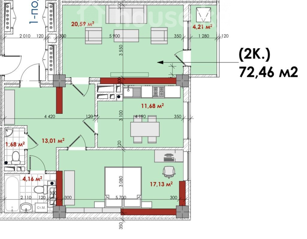 2-комн. кв., 73 м2