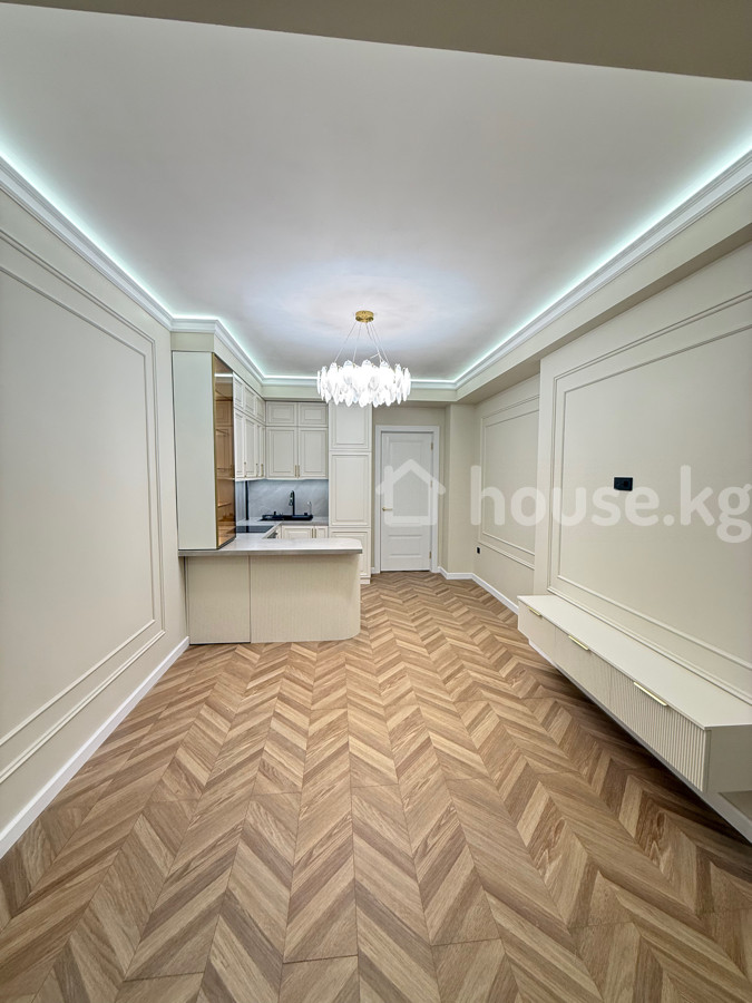 Квартира расположена на 4 этаже 14-этажного дома, блок А1 — оптимальный уровень для комфортного проживания: достаточно света, уединения и ощущения высоты, при этом сохраняется связь с городской средой. Интерьер выполнен в стиле современной классики с элементами минимализма. Пространство построено на мягкой нейтральной палитре — теплые молочные и кремовые оттенки стен деликатно подчёркивают архитектурную геометрию молдингов и создают ощущение спокойствия и гармонии. Главным акцентом выступает выразительный пол с укладкой «французская ёлка» в натуральных древесных оттенках. Он добавляет динамику, глубину и благородство пространству, визуально удлиняя помещение. Потолок оформлен скрытой контурной подсветкой, создающей эффект парящего пространства и мягкого рассеянного света. Центральная люстра с изящными стеклянными элементами добавляет интерьеру лёгкость и нотку арт-деко. Кухонная зона аккуратно интегрирована в пространство: светлые фасады, лаконичная фурнитура в тёплом металлическом оттенке и округлые формы острова придают интерьеру мягкость и завершённость. Встроенные системы хранения поддерживают чистоту линий и ощущение порядка. Плотные шторы в благородном серо-бежевом оттенке завершают композицию, добавляя текстильную глубину и уют. В целом интерьер сочетает в себе статусность, спокойствие и современную функциональность — пространство, в котором комфорт встречается с эстетикой.