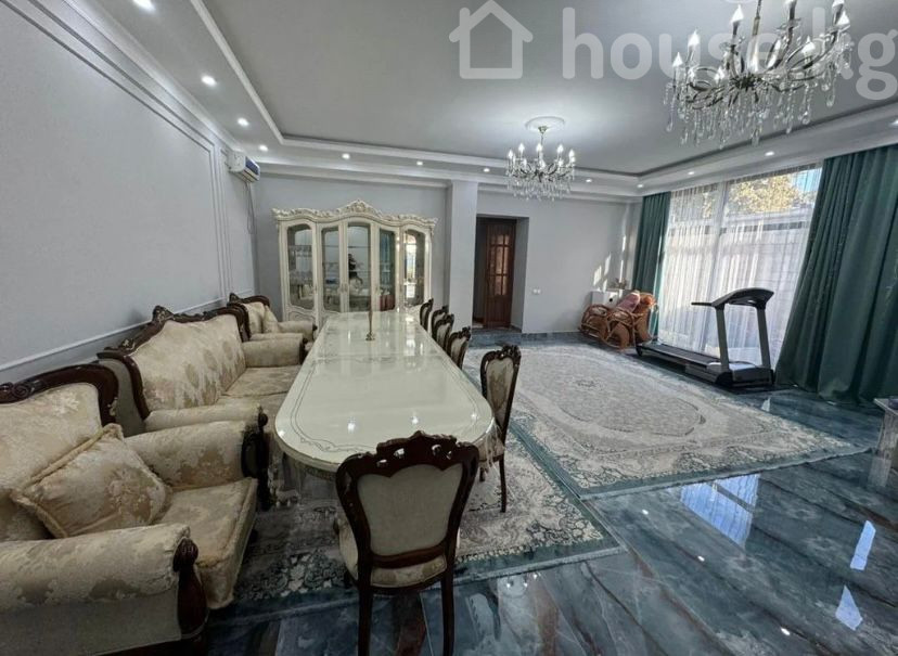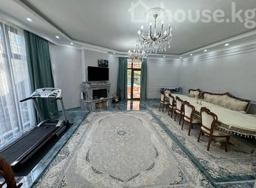 Продаётся дом в районе Киргизия-1 Площадь дома: 170 м² Участок: 10,44 сотки Дом с просторным залом/гостиной в классическом стиле, продуманной планировкой и акцентом на комфорт и представительность. Большое открытое пространство с высокими потолками и панорамными окнами в пол, плотные изумрудные шторы, встроенная точечная подсветка по периметру и две хрустальные люстры. Пол — глянцевая крупноформатная плитка под мрамор, большие ковры в пастельной гамме. Функционально зонировано: • зона отдыха с классическим комплектом мягкой мебели; • обеденная зона с овальным столом, стульями и буфетом-витриной; • медиа-зона с мраморным камин-порталом, ТВ и нишей для дров. Дополнительно: беговая дорожка, массажное/качающееся кресло. Отдельный выход через стеклянные двери на террасу/двор. Продаётся частично с мебелью. ⸻ Цена: 485000 $ Торг — при осмотре ☎️Тел: 0701/698/025 Умар Борбор недвижимость ID: 9064