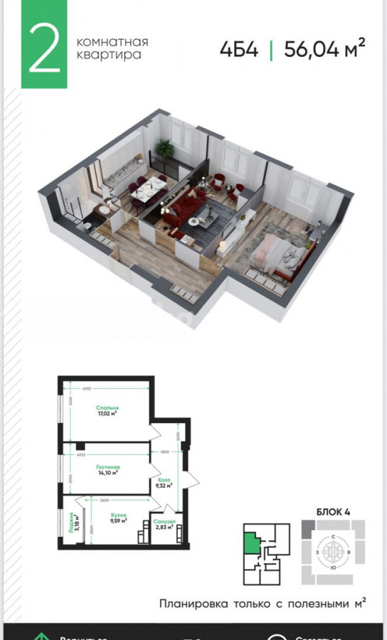 2-room apartment, 56 sq. m