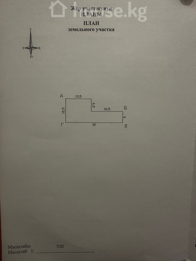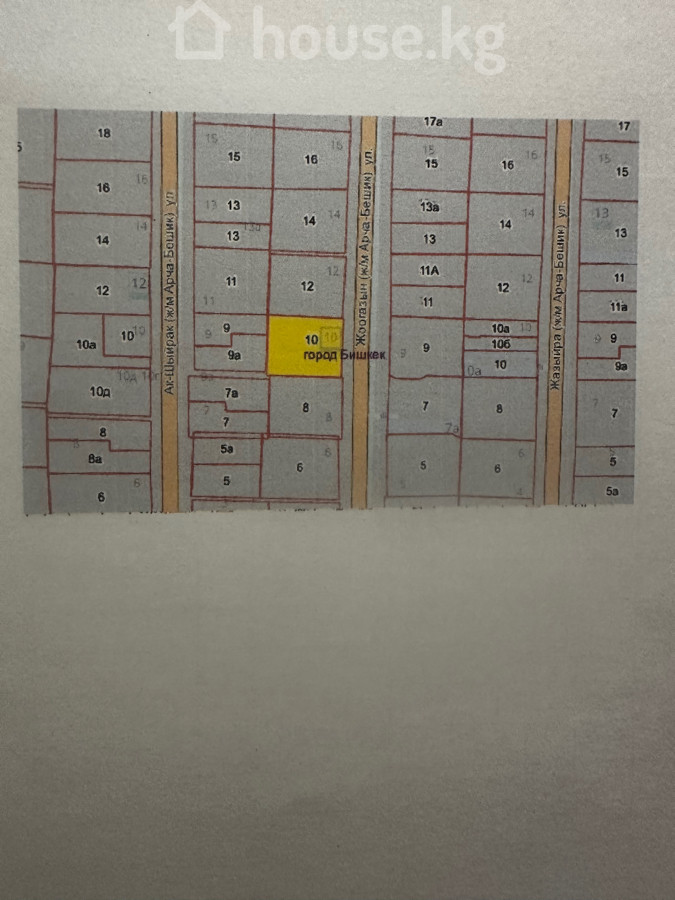 Земельный участок в г. Бишкек в жилмассиве Арча Бешик улица Жоогазын 10,размером 2,67 соток, отлично подходит для строительства жилого дома Характеристики: - Целевое назначение: частная собственность (есть государственный акт — красная книга). - Форма участка сложной конфигурации; ориентировочные размеры по сторонам на плане: 30 м, 12,5 м, 13,3 м, 5 м, 16,9 м, 9 м (см. чертеж). - Прямой выезд на внутриквартальные улицы; на Ахунбаева и Магистраль, Чортекова Подходит для индивидуального жилищного строительства, рядом имеется школа, много детских садов, 4 горбольница,расположение очень удобное. Торг приветствуется.