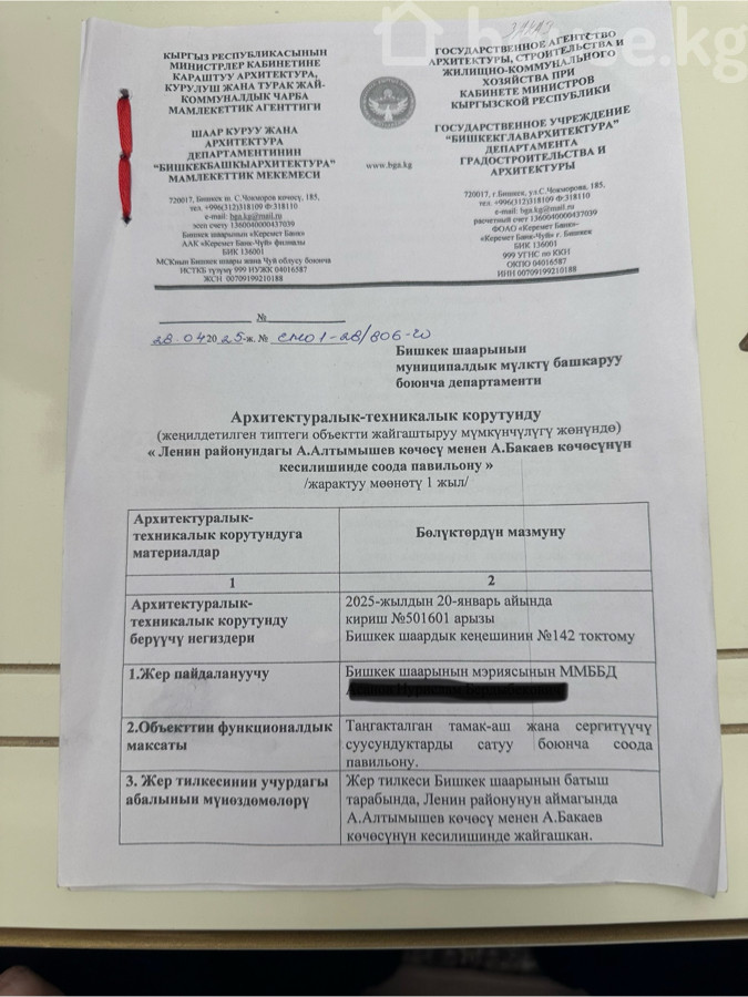 Готовый проект под продовольственный магазин | ТОП-локация Передаётся готовый проект с полным пакетом разрешительных документов под строительство продовольственного магазина 50 м² + 8 м² навес. 📍 Локация: г. Бишкек, ул. Алтымышева — напротив школы-лицея №74 — первая линия, высокий пешеходный трафик — рядом действующие магазины, кафе, остановки — плотная жилая застройка 🟩 Площадь объекта: 50 м² + 8 м² навес 🟩 Земля: муниципальная (оформлено право пользования, возможна передача прав с согласия мэрии) ⸻ 🔹 В наличии: • полный пакет разрешительной документации • АТЗ / АПЗ • проект под продовольственный магазин • целевое назначение утверждено • объект можно начинать реализовывать сразу после переоформления ⸻ 🔹 Формат сделки: • передача прав • уступка проекта и документации • оформление через мэрию / земельный комитет • сопровождение сделки до полного переоформления ⸻ 🔹 Подойдёт для: • продуктового магазина • минимаркета • сетевого ритейла • аптеки / торгового павильона (при сохранении назначения) 💰Рассмотрю продажу проекта, обмен, либо другие варианты сотрудничества.