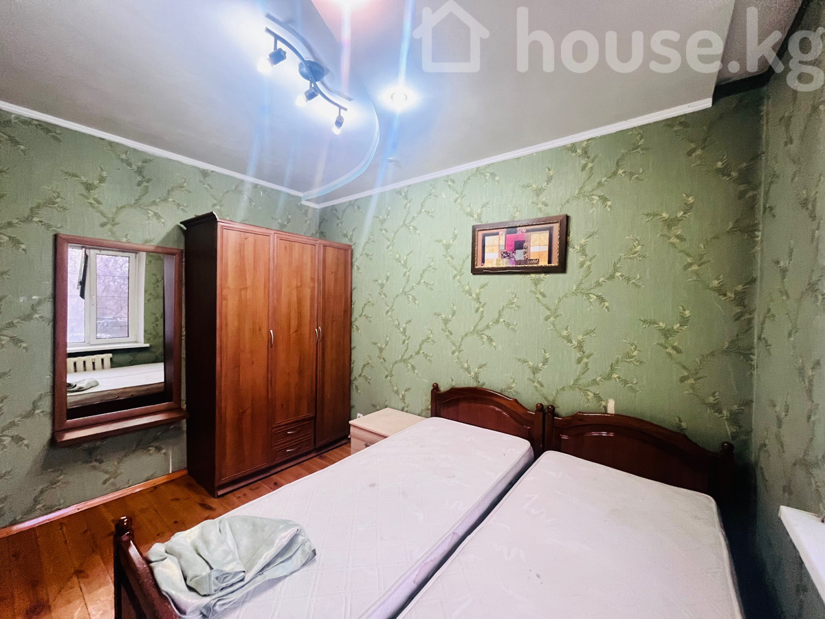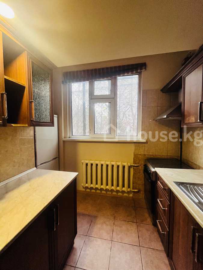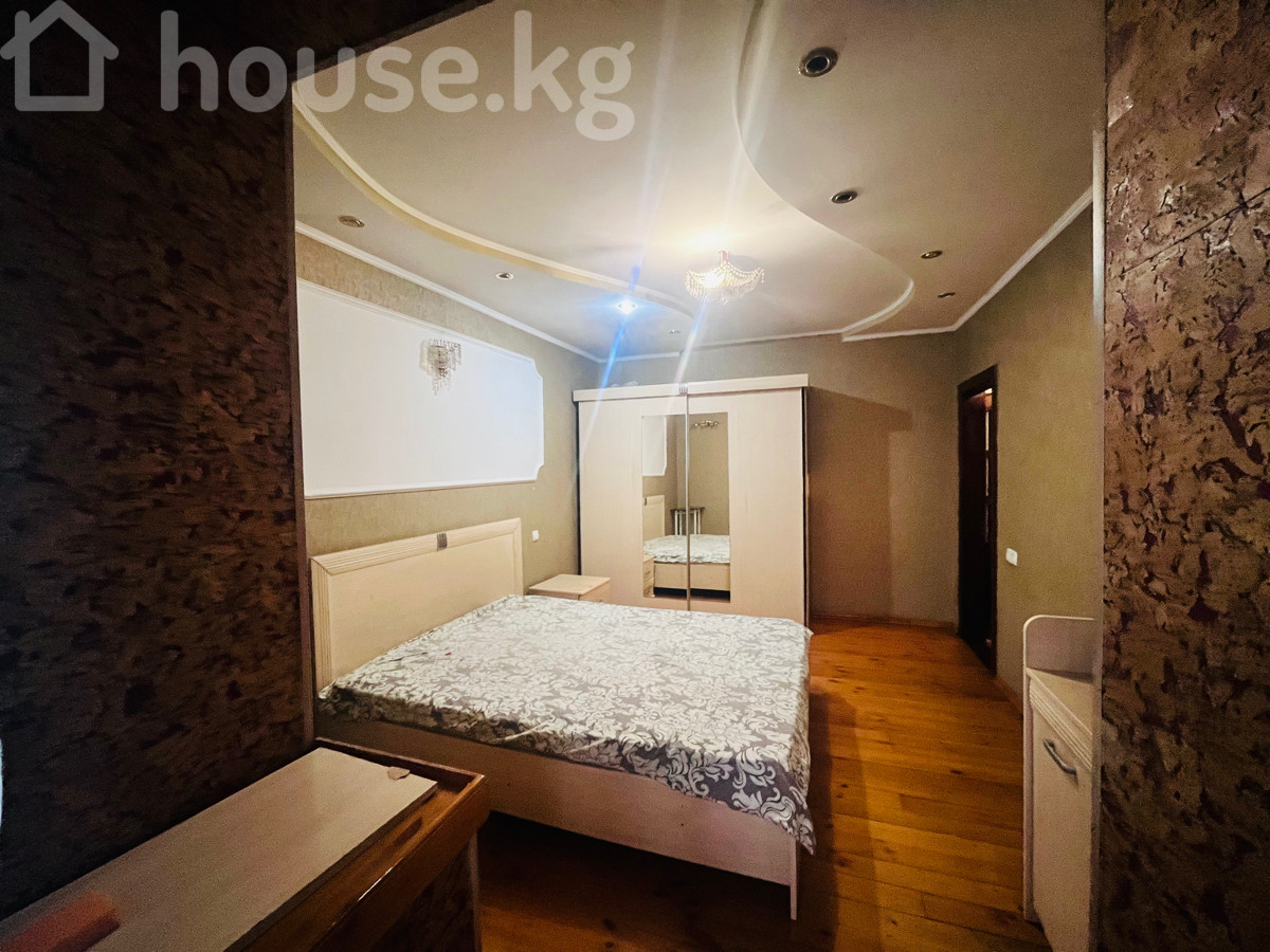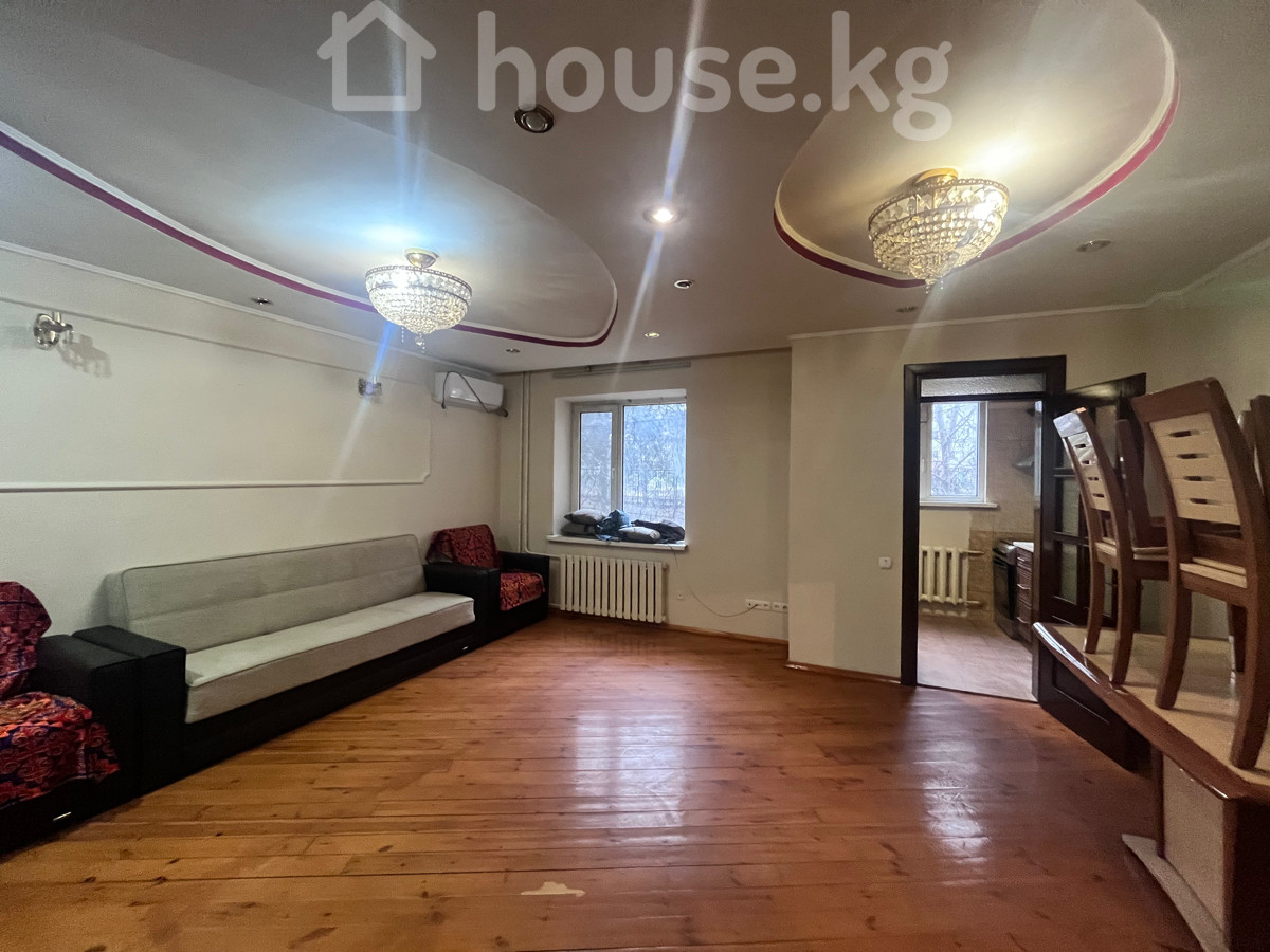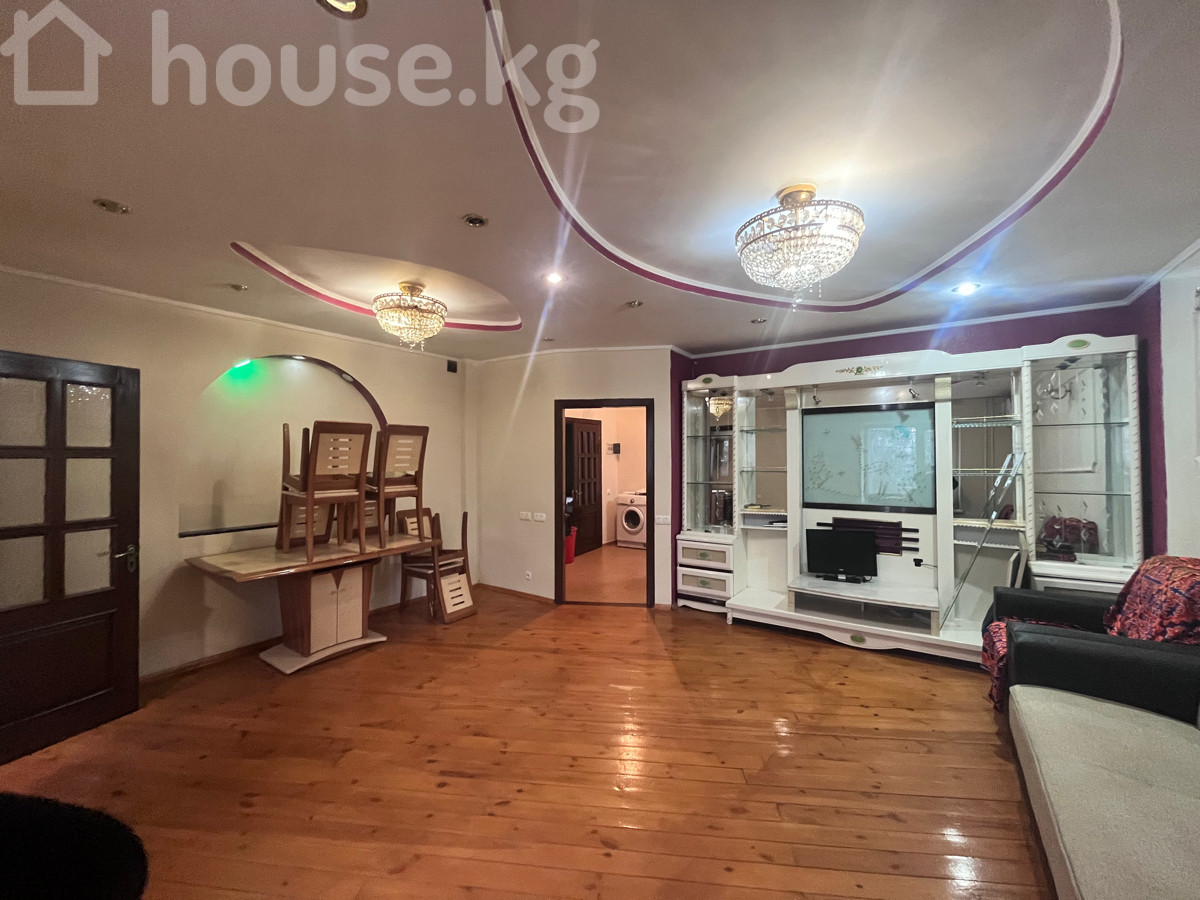 Сдается просторная 3х‑комнатная квартира Студия, на 1/5 этаже, 66 м2, по ул. Тыныстанова /Боконбаева, с мебелью и техникой. Дом индивидуальной планировки. Все коммуникации центральные. Удобная транспортная развязка . - Планировка: большая гостиная открытого типа, отдельные 2спальни, кухня, прихожая, санузел (не показан на фото), застекленная лоджия. - Отделка и свет: многоуровневые потолки с точечными светильниками и хрустальными люстрами, декоративные стеновые панели/молдинги. Пол — натуральная доска. - Окна: пластиковые стеклопакеты, вид во двор. Радиаторы отопления. - Климат: установлен кондиционер. - Мебель: - гостиная: длинный диван, два кресла, большая стенка‑витрина с местом под ТВ, журнальные/пристенные тумбы, комплект обеденных стульев и стол; - спальня: двуспальная кровать, прикроватная тумба, туалетный столик с зеркалом, шкаф. - Кухня: отдельное помещение, газовая плита, вытяжка, мойка, рабочие поверхности, доступ к лоджии/эркеру. - Бытовая техника: телевизор, стиральная машина (в зоне прихожей/санузла на фото), кондиционер. - Комфорт: много розеток и вывода под интернет/ТВ, нишевые решения для хранения, стеклянные витрины, межкомнатные двери из темного дерева. Квартира готова к проживанию: есть спальные места, место для хранения, оборудованная кухня и базовая техника. Тихий зеленый двор за окнами.