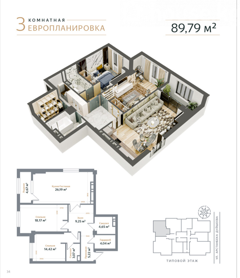 3-комнатная квартира студия в ЖК Regency от СК Nurzaman. ФЛАГМАНСКИЙ ДОМ. Площадь: 89,79 м². - Просторная кухня-гостиная — 26,19 м² - Спальня — 18,17 м² - Спальня — 14,42 м² - Холл — 9,25 м² - Санузел — 4,65 м² - Гардероб — 4,04 м² - Лоджия — 4,67 м² - Премиальная архитектура, фасад из керамогранита - 15 этажей, 104 квартиры, высота потолков 3,4м. - Современный двор с ландшафтным дизайном - Сейсмостойкость здания 9+ баллов - Поквартирная индивидуальная система с газовым котлом - Три скоростных бесшумных лифта - Двухуровневый подземный паркинг на 54 машиноместа район Асанбай. Выше Ю. Магистрали пл Сухэ-Батора, школа Газпрома. Regency — дом в центре премиального жилья.