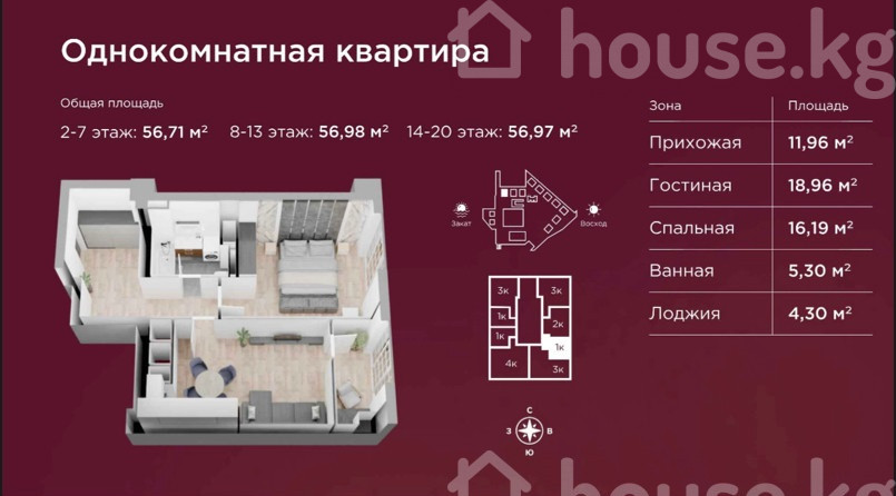 56.97 sq. m, kitchen: 18.96 sq. m