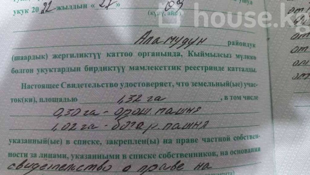 Внимание! Понижение цены! Продается участок орошаемой земли 30 соток в селе Беш-Кунгей! Участок правильной формы 13х225 м расположен по трассе выше села слева. Ориентир - конечная 51 автобуса. К этому участку прилагается кайрак (богарная пашня) размером 1 Га, расположенный поблизости на холмах. Участки общей площадью 1.32 Га продаются вместе, то есть неделимы Назначение - сельское хозяйство или производство. Идеально под выращивание малины, клубники, смородины и проч. Также, в соответствии с недавно принятым законопроектом о трансформации земель для инвестпроектов, появится возможность на перевод орошаемых пахотных земель в другие категории и виды пригодных земель, в том числе для ИЖС или строительства загородного коттеджного городка. С поливом проблем нет. Рядом с участком проходит быстроток и река. Из коммуникаций - электричество. Есть возможность подвести из села водопровод и газ. Собственник, документы в порядке, без обременений. Свидетельство о праве на частную собственность на земельный участок (доли). Понижение цены!!! Срочная цена за 1.32 Га - 95.000$
