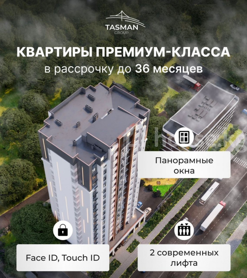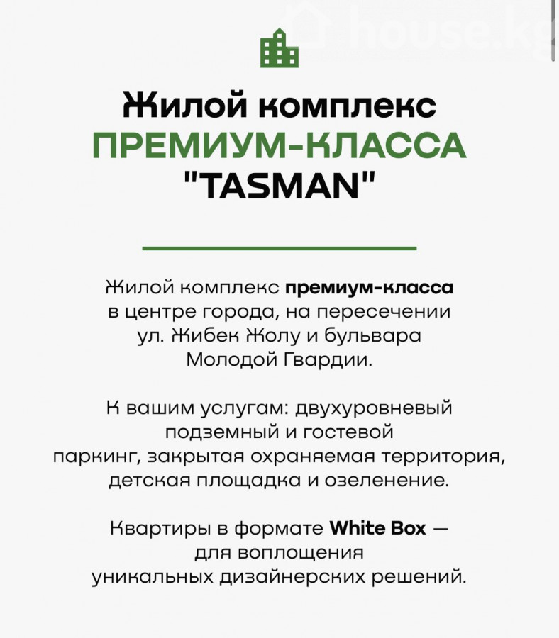Жилой комплекс премиум-класса "Тасман" расположен в центре города Бишкек, на пересечении улицы Жибек Жолу и бульвара Молодой Гвардии. Это современное 17-этажное здание с базальтовым утеплением, обеспечивающее высокий уровень шумоизоляции и комфорт проживания. Комплекс предлагает квартиры в формате White Box, что позволяет реализовать уникальные дизайнерские решения. Для удобства жителей предусмотрены двухуровневый подземный паркинг, гостевые парковочные места, охраняемая территория с видеонаблюдением и просторная детская площадка с мягким покрытием. В "Тасмане" используются современные материалы и технологии строительства, включая алюминиевые профили для панорамных окон, бронированные входные двери и системы умного доступа с FaceID и TouchID. В доме установлены скоростные лифты. Инфраструктура комплекса включает центральные коммуникации, надежные кирпичные стены и благоустроенную парковую зону рядом с домом. Для удобства клиентов предлагается рассрочка оплаты до 36 месяцев, возможность обмена на автомобиль или другую недвижимость, а также варианты оплаты через банк или наличными.