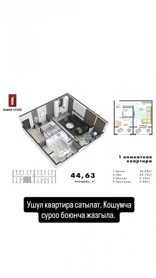 продается 1 ком квартира в районе технопарка, сдан под ПСО ЖК "Элдик", СК Памир строй Площадь: 45 кв м стоимость: 47.500$ amanat invest ID3314