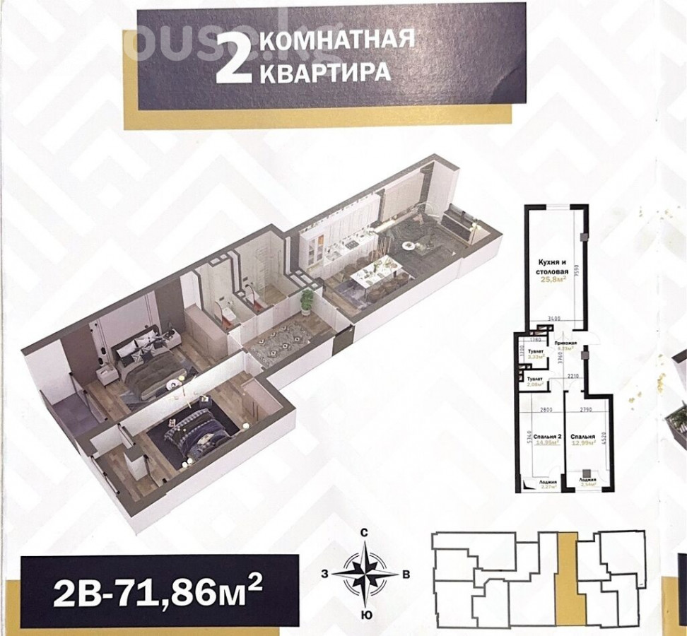 Тип объекта: Квартира, Серия: Элитка ЖК: Арзуу Всего этажей: 9 Название застройщика: ричтаун Этап: Сдан ПСО Количество комнат: 2 Этаж: 6 Площадь: 72 м2 Линия: Первая Топосъемка: Да Материал стен: Кирпич Состояние: С ремонтом (дизайнерский) Канализация: центральное Отопление: Центральное Документы : Договор долевого участия Какие условия рассматривает : Наличные Описание объекта: Продается 2-комнатная квартира в Элитке: ✅ Площадь: 72 м² ✅ Этаж: 6/9 ✅ Кухня: 26 м² ✅ Район: Таатан ТЦ ✅ Серия: Элитка ✅ Отопление: Центральное ✅ Ремонт: ПСО (под самоотделку) ✅ Материал стен: Кирпич ✅ Год постройки: 2024 ✅ Балкон/лоджия: Застеклен ✅ Бронированные двери ✅ Лифт в доме ✅ Тип сделки: Наличный расчет ✅ Правоустанавливающие документы: ДДУ id: 1395 Район: Центр