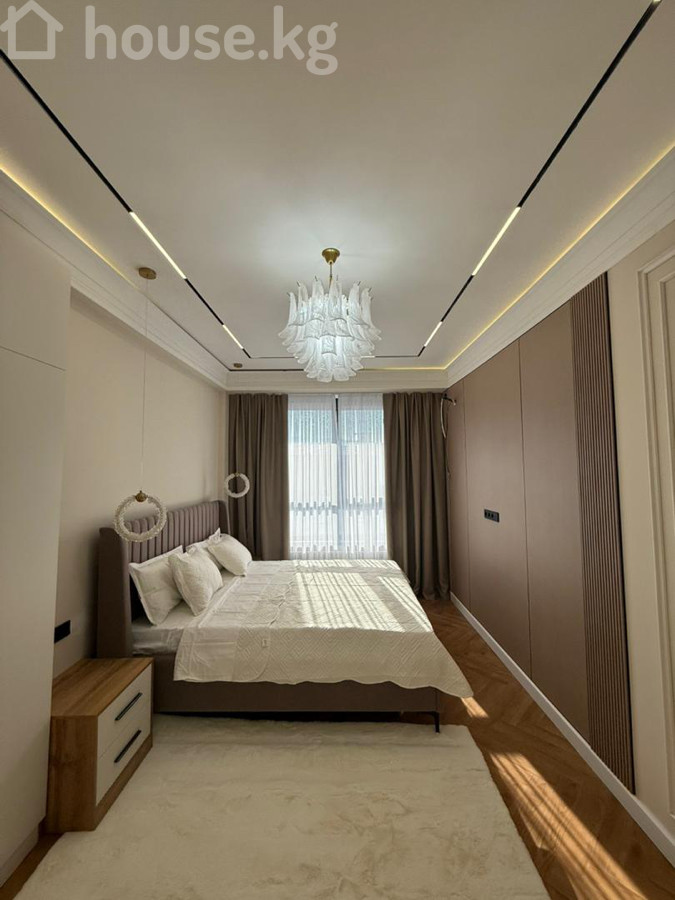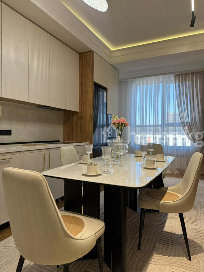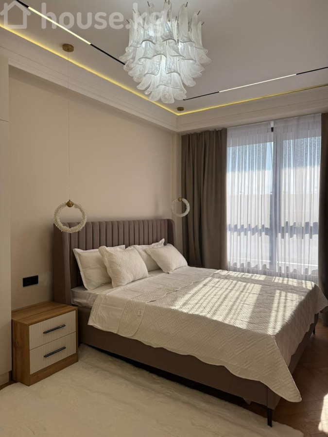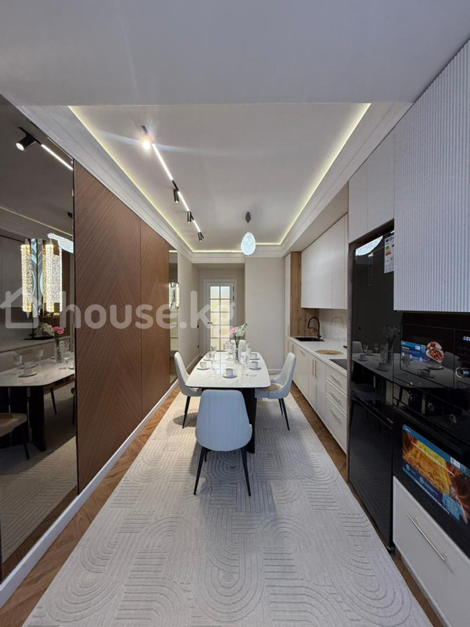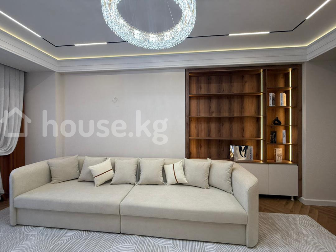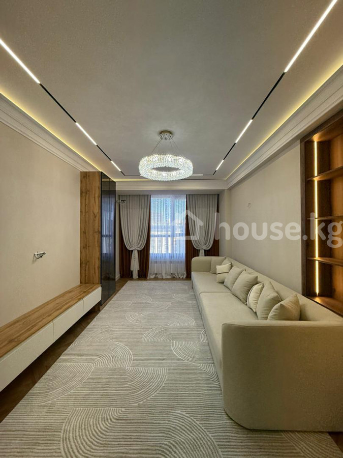 Продается 2‑комнатная квартира в ЖК «Нурзаман Сити» Адрес: Асанбай Серия: элитка Этаж/этажность: 14/15 Площадь: 83 м² Коммуникации: свет, газ, вода Отопление: газовое Планировка: сквозная Санузел: совмещенный Документы: ДДУ Цена: 170 000$ О квартире: - Дизайнерский ремонт в современном стиле - Просторная гостиная с большим модульным диваном, встроенной стенкой/библиотекой с подсветкой - Потолочное зонирование с контурной и линейной LED‑подсветкой, центральные хрустальные люстры - Панорамные окна с двойными шторами (блэкаут и тюль) - Напольное покрытие — паркетная елочка; в зоне гостиной — фактурный ковёр - Встроенные системы хранения, закрытые и открытые стеллажи - Качественные межкомнатные двери с остеклением Квартира светлая, продуманная по эргономике и готовая к проживанию.