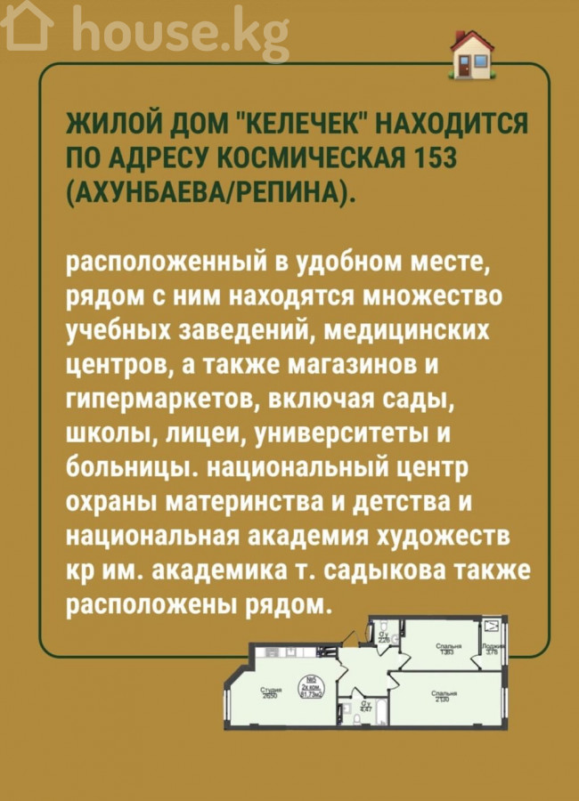 🏡 Продается 2-комнатная квартира-студия ЖК "Келечек" от СК "Эл-Ордо" 📍 Адрес: ул. Комсомольская 153 (Ахунбаева / Репина, мкр. Арча-Бешик) 📅 Год постройки: 2024 (сдача ПСО в июне) 🔍 Характеристики объекта: Площадь общая: 82 м² Площадь кухни: 26 м² Этаж: 2 из 9 Тип дома: Кирпичный, "Элитка" Ремонт: ПСО (под самоотделку) Санузел: Раздельный Отопление: Автономное Документы: ДДУ, Красная книга Цена: $83000 🛡️ Дополнительные плюсы: Закрытая территория Бронированные двери Вид на горы Лифт Охрана Не угловая Никогда не сдавалась Не затапливалась 💵 Тип сделки: Наличный расчет