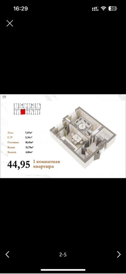 45 м2, жилая: 19 м2, кухня: 12 м2