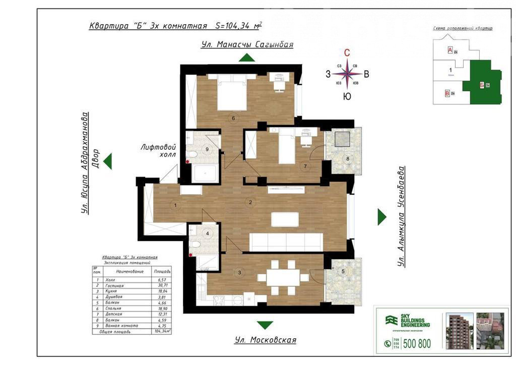 Продается трёхкомнатная квартира в новом шикарном элитном , клубном доме , общая площадь 104,34 м²., 6/10 этаж, по ул. Усенбаева /Москоская Застройщик : Sky building ЖК : Winchester Особенности планировки: - Просторная гостиная 30,81 м² с выходом на балкон. - Кухня 18,04 м², удобно отделена от зоны гостиной. - Две изолированные спальни: 12,85 м² и 18,56 м². - Два санузла: совмещённый 4,59 м² и гостевой 1,65 м². - Холл 6,57 м² и гардеробная/кладовая 1,64 м². - Лоджия у одной из спален и отдельная лоджия у кухни. - Окна на несколько сторон света, продуманная инсоляция. Дом: - Невысотный клубный формат, монолит/кирпич, современный фасад в кирпиче. - Индивидуальные балконы с металлическими ограждениями. - Подсветка фасада, закрытая придомовая территория с ограждением. - Лифтовой холл, малоквартирные этажи. - Развитое окружение городской застройки. Локация по поэтажному плану: пересечение ул.Усенбаева, Московская, Юсупа Абдрахманова (ориентиры указаны на схеме).