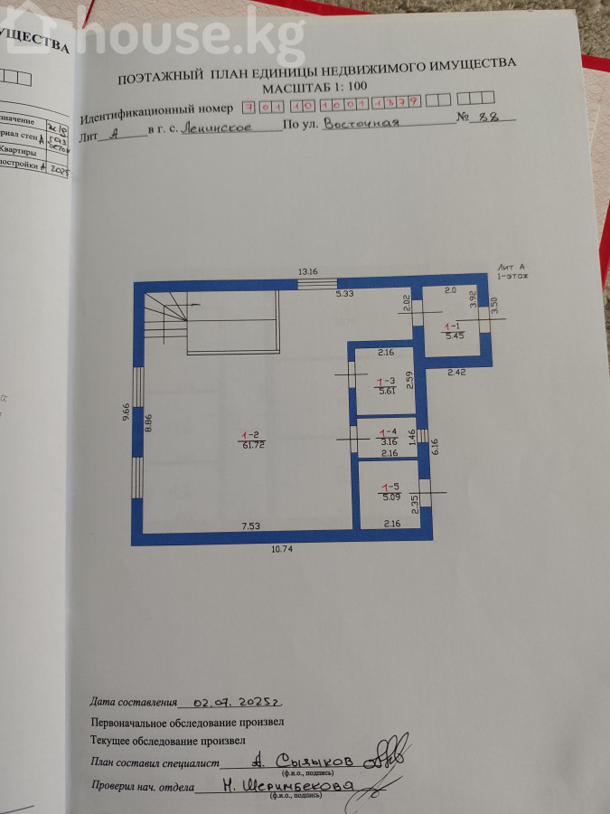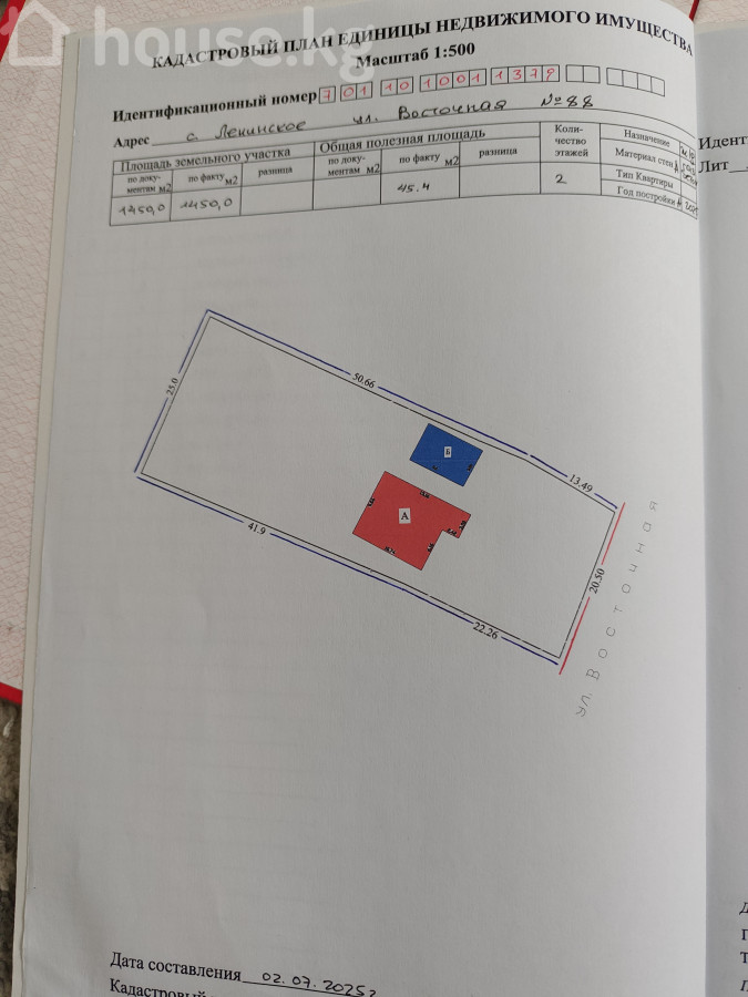 Продается жилой дом с земельным участком (право частной собственности подтверждено государственным актом). Расположение: Кыргызстан, Ленинское , ул. Восточная, дом №88. Характеристики дома: - Индивидуальный 2‑этажный жилой дом. Ж/б каркас + газобетонные блоки. - Поэтажные планы в масштабе 1:100 прилагаются. - Лестничный узел внутри дома. Два санузла, три спальни, две гардеробных, кладовка, два кондиционера. Отопление: три вида топливных котлов в одной системе, водяной теплый пол на двух этажах. Участок: - Земля в частной собственности - Во дворе есть свободная площадка под парковку/хозблок, подъезд с гравийным покрытием. Архитектура и внешний вид: - Современный двухскатный кров, пластиковые окна, оформленный входной тамбур/крыльцо. - Фасад с контрастной отделкой. Документы: - Государственный акт о праве частной собственности на земельный участок. - Поэтажные планы объекта недвижимости с идентификационным номером, адресом и подписями специалистов.