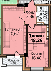 1-room apartment, 48.26 sq. m