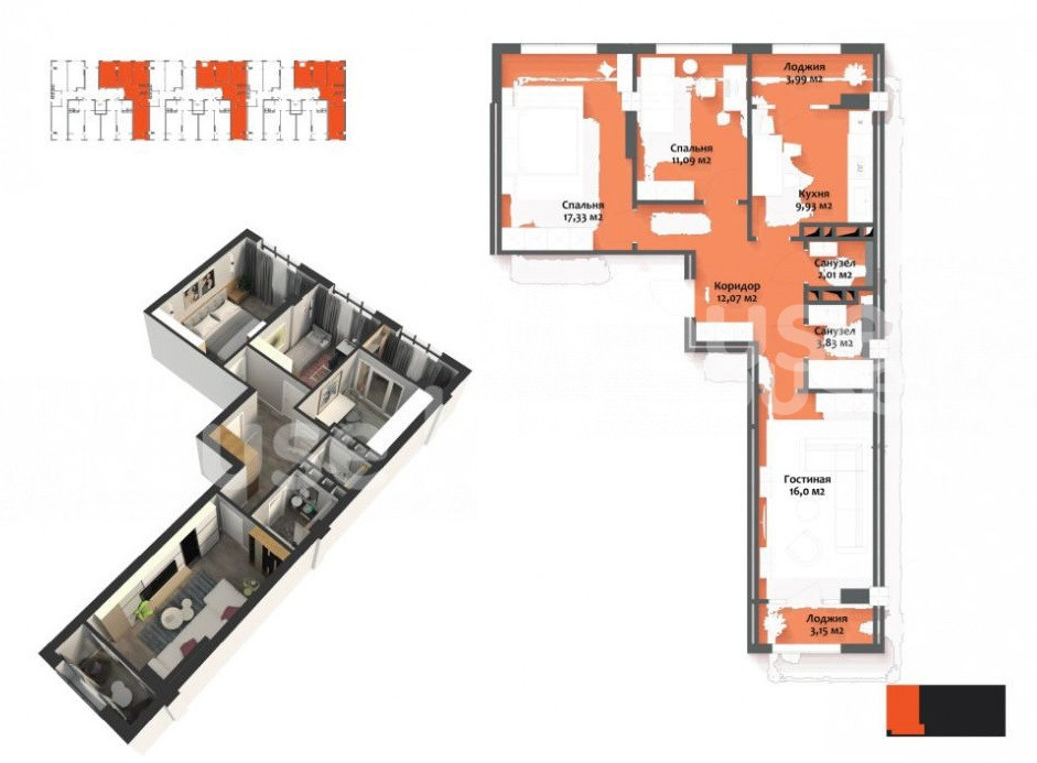 3-room apartment, 80 sq. m