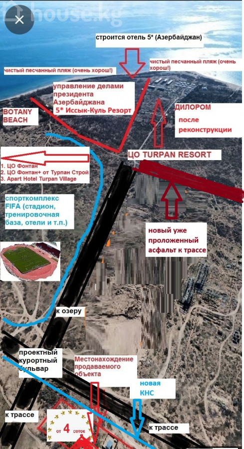 🔥 1 последний участок для продажи 4 сотки у Иссык-Куля ниже трассы у Чолпон-Ата в Кара-Ой (Долинка) | за 30000$ 🔥 ✅ 1 последний свободный участок в новом коттеджном поселке INHouse Village - ниже трассы на 2,5 км и всего лишь 1 км от озера и с видом на него! Расположение есть на скрине среди фото в объявлении, просмотрев которые вы поймете насколько перспективна данная локация уже в ближайшее время! ✅ Красная книга. Назначение: строительство гостевых коттеджей / туробъектов ✅ Коммуникации: электричество 3 фазы, вода, канализация, круглогодичный подъезд ✅ Тихо, чисто, без шума трассы и пансионатов ✅ Рядом: горячие источники, известные пансионаты, множество современных строящихся отелей, будущий спорткомплекс FIFA (уже скоро начнут строить, проектные работы ведутся, коммуникации для него уже выделены). Район активно развивается! 💥 Отличная инвестиция — цены постоянно растут и вырастут еще в разы! 💬 Помощь в строительстве — от 450$/м², коттеджи по теплой зимой и прохладной летом финской технологии 📞 Звоните / пишите — всё расскажу, скину локацию. 💬 Хотите больше информации? Пишите мне в WhatsApp 👇 - номер в объявлении. 📷 Смотрите также фото и схему расположения в объявлении! --- Более развёрнутая информация предоставлена ниже по тексту: 🔥 Участок на берегу Иссык-Куля | Кара-Ой (Долинка) | 4 сотки | 30000$ 🔥 Продается последний свободный участок (за 30000$) в новом коттеджном поселке на берегу Иссык-Куля, в с. Кара-Ой (Долинка). --- 📍 Локация: Ниже трассы — 2,5 км. До озера — всего 1 км, песчаный пляж с пологим заходом, идеально для семей с детьми. Участок на пересечении двух будущих курортных дорог (третью курортную уже проложили новый асфальт в 2025году) — отличная локация для бизнеса или отдыха. Тихо, экологично, зимой почти нет снега. --- 📄 Документы и статус: Красная книга Назначение: строительство гостевых коттеджей, туробъектов По генплану — зона общекурортного гостиничного комплекса --- 💡 Коммуникации: Электричество (3 фазы, медь) Вода, канализация Круглогодичный подъезд --- 🏝 Инфраструктура и соседство: Рядом: 4 горячих источника, элитные пансионаты, новые отели (Turpan Resort, 5★ отель от управделами президента Азербайджана Иссык-Куль Резорт с обширной инфраструктурой для отдыха, Turpan Village, Seven Sunny Days, Фонтан+, Turpan Forte и многие др.) В 100 м: будущий международный спорткомплекс FIFA (стадионы, отели, магазины) --- 💰 Инвестиции с потенциалом: Рыночная цена уже растет кратно в ближайшие годы – все вокруг активно застраивается Можно купить участок сейчас, а строиться позже --- 🏗 Строительство под ключ — от 450$/м² Каркасная финская технология (не СИП!), адаптированная к климату Суперэнергоэффективные дома: 150 Вт обогревателя действительно достаточно для комнаты 15м2 зимой Возможность постройки по вашему проекту, в том числе поэтапно Варианты отделки, дизайн, расширение в будущем --- 🛠 Дополнительные опции: Забор, сауна, хозпостройки, кафе, магазин, бассейн, охрана Помощь в аренде — высокая окупаемость --- 📞 Контакты: Строительство от опытной команды из РФ (18 лет в строительстве). 📲 Звоните, пишите — подробно расскажу, пришлю видео, фото, схемы. Смотрите другие объекты в профиле. #ИссыкКуль #участокИссыкКуль #землянапродажу #КараОй #Долинка #участокуозера #участокКыргызстан #недвижимостьИссыкКуль #участокподбизнес #туризмКыргызстан #инвестицииИссыкКуль #коттеджныйпоселок #строител