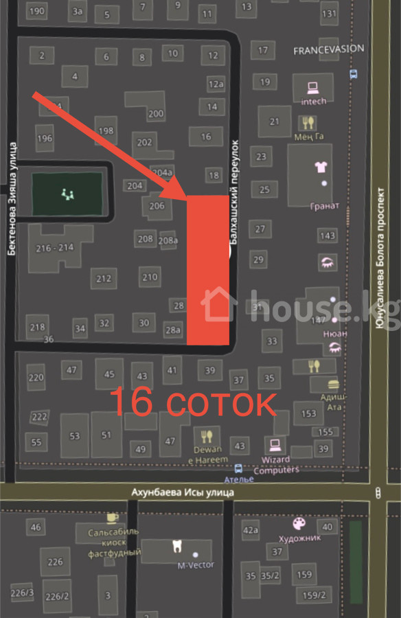 Продается участок. Район: проспект Болота Юнусолиева/ ул. Исы Акунбаева (ул. Карла Маркса/ ул. Исы Ахунбаева) Участок находится на переулке Балхашский. Заезд со стороны ул. Зияш Бектенова (Днепропетровская) Тихое место вблизи центральных дорог. Площадь участка 4 сотки. 3-линия от ул. Карла Маркса. На участке дом 58,9 м2, 4 комнаты, кухня, туалет, ванная. Саман. Отдельно стоящая баня, гараж. Газ, центральная канализация, электричество. Есть возможность расширения площади участка до 6, 8, 12, 16 соток. Подробности при встрече или по телефону. Только продажа, обмен не предлагать. Собственник.