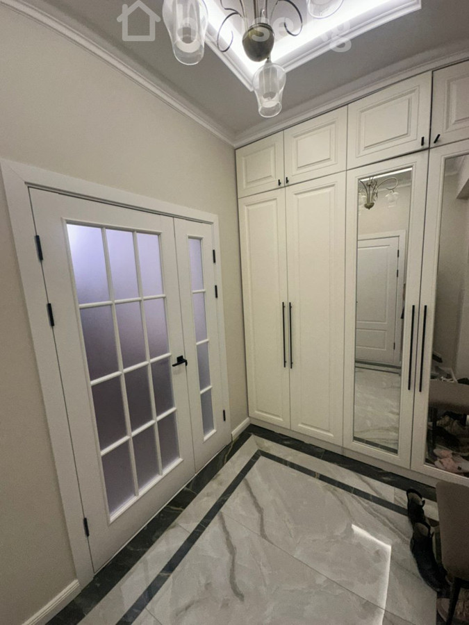 Светлая современная 2комнатная студийная квартира с продуманной планировкой и качественной отделкой. - Гостиная-столовая с высоким потолком, декоративными молдингами, точечным освещением и хрустальной люстрой. Настенное ТВ, подвесная тумба с рейками, витрина со стеклянной дверцей. - Уютная обеденная зона: овальный стол и четыре мягких стула. - Большие панорамные окна с двойными шторами (плотные + тюль) обеспечивают много естественного света. Установлен кондиционер. - Диван угловой в нейтральном серо-бирюзовом оттенке; ковёр. - Раздвижные межкомнатные двери со стеклянными вставками. - Пол — ёлочка (ПВХ/ламинат), светлые стены с лепниной и потолочный карниз по периметру. - Санузел совмещённый: ванна, подвесной унитаз, вместительные шкафы, тумба с накладной раковиной и круглым подсвеченным зеркалом. Отделка крупноформатным керамогранитом под мрамор. Стиральная машина встроена в шкаф. - Кухонная зона визуально отделена, есть встроенный шкаф-купе/гардероб (за раздвижной прозрачной перегородкой). Интерьер выполнен в спокойной бежево-натуральной гамме с латунными акцентами и современной подсветкой. Квартира полностью меблирована и оснащена базовой техникой. Отлично подойдёт для комфортного проживания и приёма гостей.