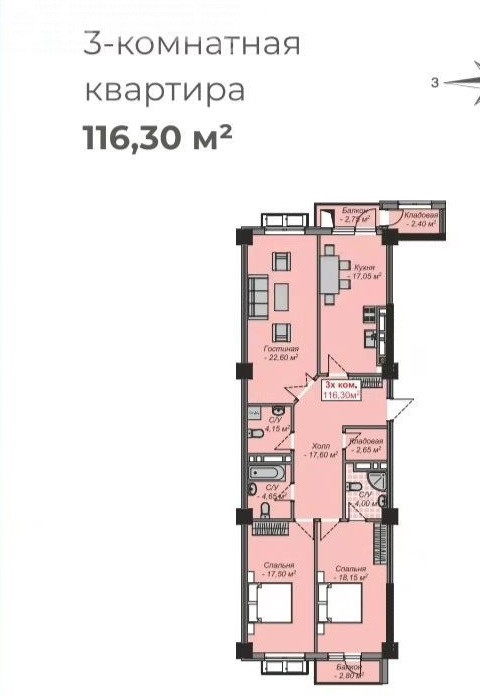 3-room apartment, 116 sq. m