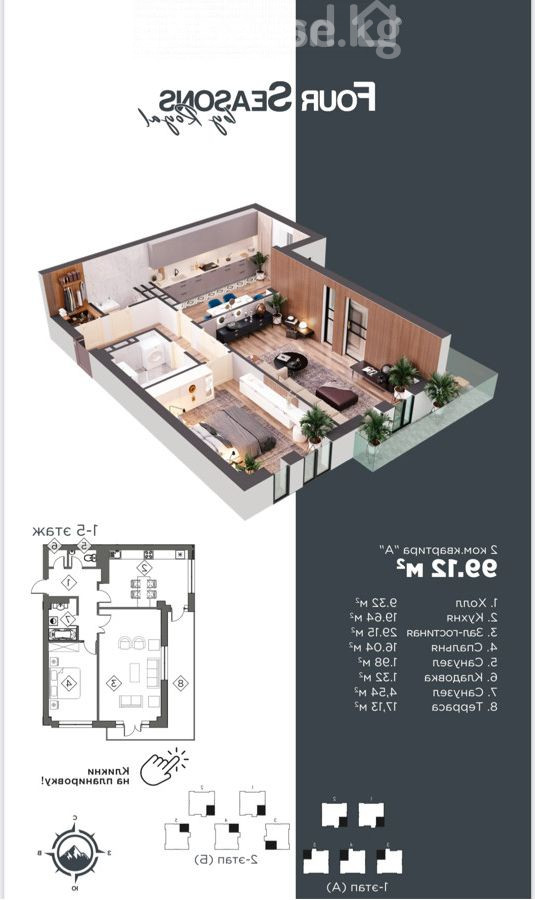 Продается двухкомнатная квартира площадью 99 м² в клубном городке премиум-класса FOUR SEASONS, село Байтик, от застройщика Роял Констракшн. Основные характеристики: Дом премиум-класса, всего 5 домов по 25 квартир на участке 1,3 гектара. Под благоустройство отведено 80% территории. Состояние: White Box (не ПСО). Сдача в эксплуатацию: конец 2025 года. Высота потолков: 3,3 м. Алюминиевые окна теплой серии. Красная книга. Индивидуальная планировка. Круговая тепло- и шумоизоляция. Лифты европейского стандарта. Инфраструктура и удобства для резидентов: Фитнес-зал и парилка. Келлер (комната хранения), отдельный паркинг. Воркаут-зона и беговые дорожки. Подземный и гостевой паркинг. Тематические многофункциональные детские площадки. Газовое отопление. Закрытая охраняемая территория с охраной 24/7 и системой видеонаблюдения. Прогулочные зоны, просторный двор. Современная архитектура и премиальные материалы. Преимущества премиум-класса по сравнению с бизнес-классом: Использование натуральных материалов (мрамор, дерево, натуральный камень), эксклюзивные дизайнерские решения. Развитая инфраструктура, включая ландшафтный дизайн, спортивные клубы, зоны отдыха, детские игровые площадки. Престижное и экологически чистое расположение с удобным доступом к транспортным магистралям. Продуманная концепция застройки, разработанная известными архитектурными бюро. Дополнительные удобства: энергосберегающие стекла с шумопоглощением, увеличенные оконные проемы, террасы, современные системы безопасности. Маруф ID: 74933