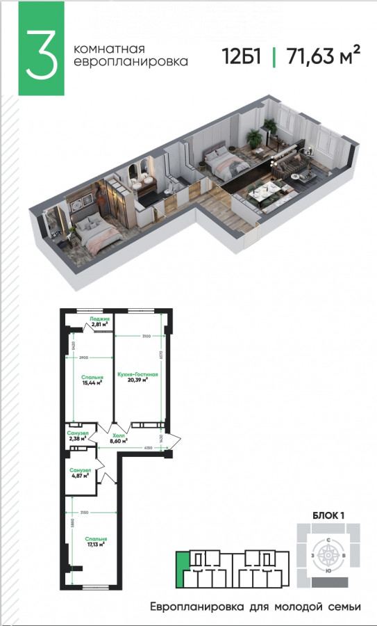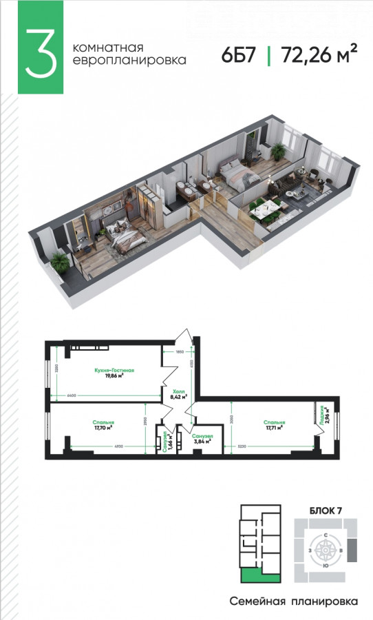 3-room apartment, 72.15 sq. m