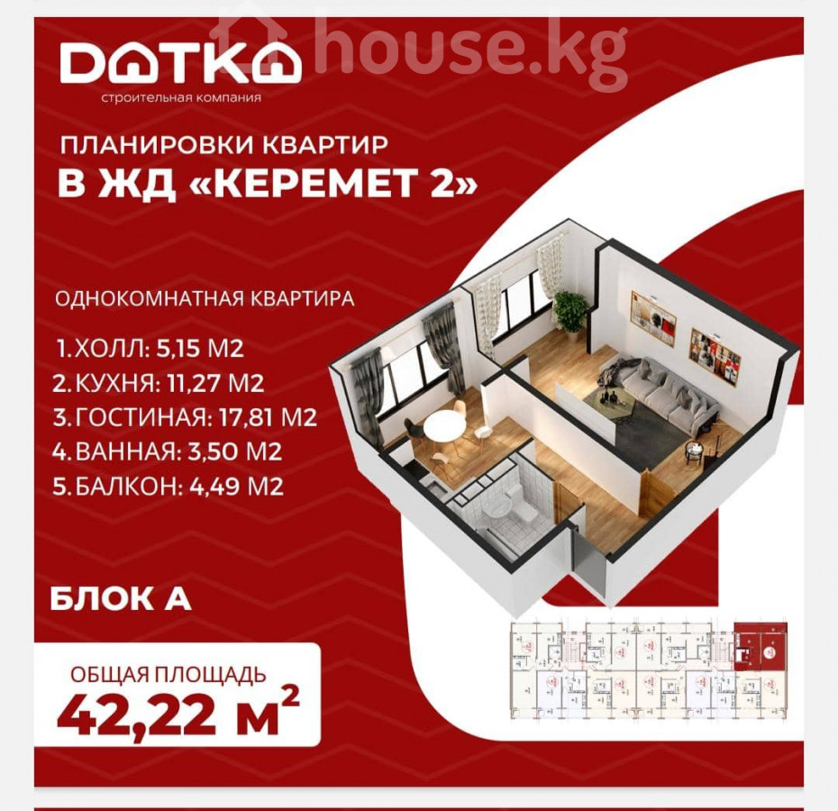 1-комн. кв., 42.22 м2, 8 этаж из 9