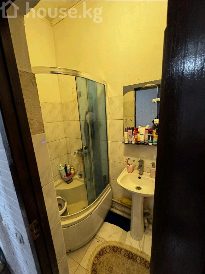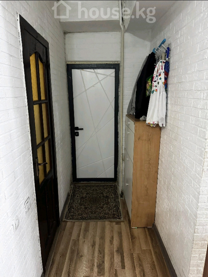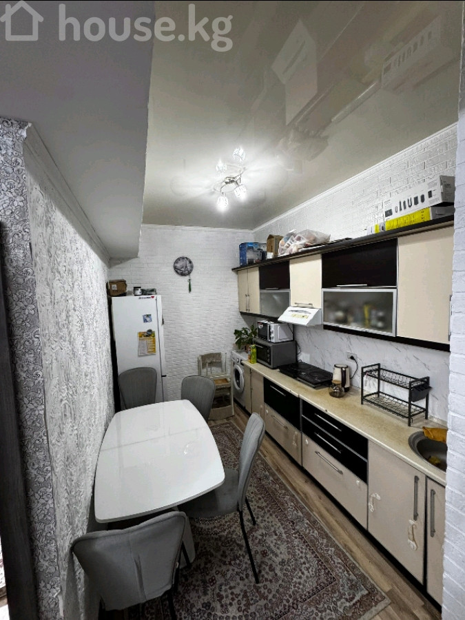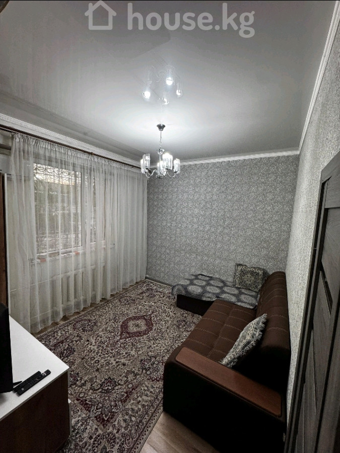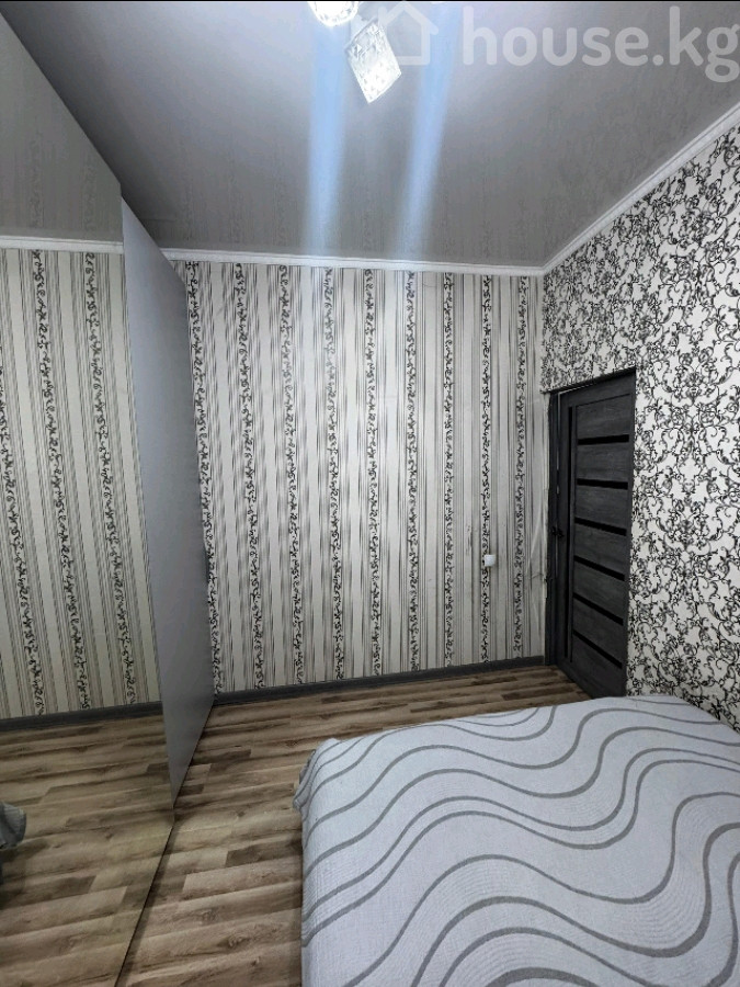 1‑комнатная квартира переделанная в 2х комнатную со спальней и гостиной. Район Пишпек. Планировка и отделка: - С большим шкафом‑купе с зеркалом во всю высоту и туалетным столиком. - Кухня с рабочей зоной, верхними и нижними шкафами, мойкой. - Санузел с душевой кабинкой. - На полу ламинат, стены оклеены обоями в спокойных тонах, натяжные потолки с современными светильниками. - Большое окно в гостиной с легкими шторами, радиатор под подоконником. - Межкомнатные двери в едином стиле, плинтусы и наличники белые. Мебель и оснащение: - Шкаф‑купе с раздвижными фасадами (зеркальный центральный). - На кухне — гарнитур. - Освещение: люстры и точечные светильники с холодным/нейтральным светом. Особенности: - Светлые, аккуратные комнаты. - Полезная планировка: приватная спальня и отдельная зона отдыха/приёма гостей.