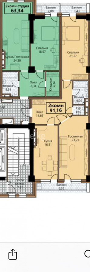 91 м2, жилая: 62 м2, кухня: 17 м2