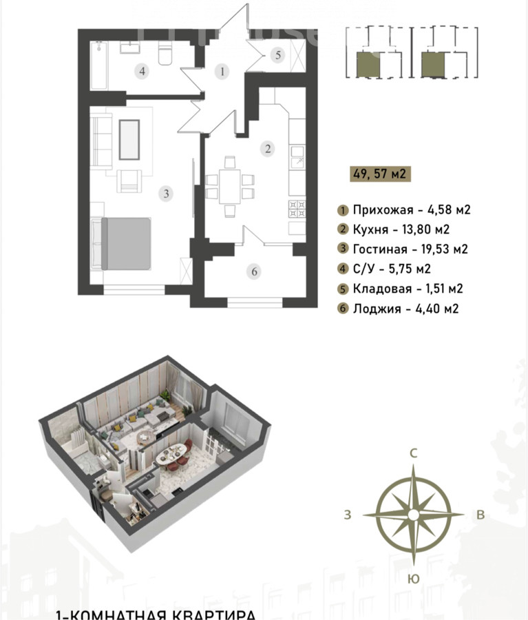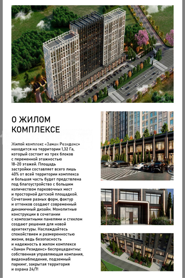 1-комнатная квартира 49,6 м² | 7 этаж | Бизнес-класс | Центр — ЖК Заман Резиденс Надежный застройщик Имарат Строй Продается просторная 1-комнатная квартира 49,57 м² на комфортном 7 этаже в современном жилом комплексе бизнес-класса. Возможна рассрочка от компании, что делает покупку гораздо доступнее. • 49,57 м² — удобная и продуманная планировка • просторная кухня 13,8 м² • светлая гостиная 19,5 м² • лоджия и кладовая • 7 этаж — оптимальная высота (меньше шума и пыли Комплекс расположен на пересечении ул. Льва Толстого и Ибраимова — в географическом центре города. В 10 минутах — торговые центры, ЦУМ, ГУМ, Детский Мир, рестораны, кофейни, банки, школы, детские сады, клиники и всё необходимое для комфортной жизни. Преимущества комплекса ✔ закрытая территория ✔ красная книга ✔ видеонаблюдение и охрана 24/7 ✔ подземный паркинг ✔ благоустроенный двор и детская площадка ✔ современная архитектура бизнес-класса Отличный вариант как для жизни, сдачи или для инвестиции. Квартиры в этом комплексе пользуются высоким спросом.