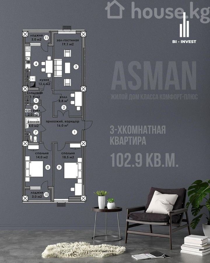 ПРОДАЕТСЯ 3-КОМНАТНАЯ КВАРТИРА В ЖК «АСМАН» мкр Кок-Жар Застройщик: *Бийиктик Инвест Жилой комплекс: Асман Характеристики:* Этаж: 10 из 12+ техэтаж Площадь: 103м² Статус: ПСО, дом сдан Цена: 109. 000 $ ID: 71005