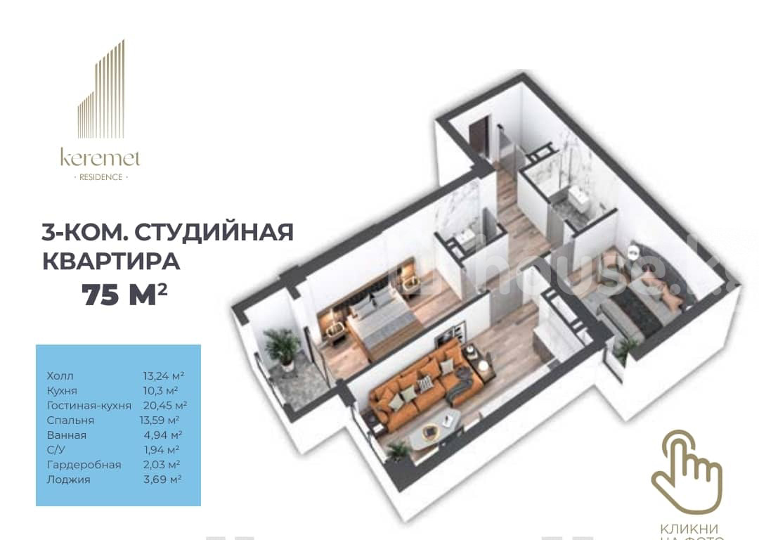 Продается 3 комнатная квартира студия, в комплексе Бизнес класс ЖК Keremet Residence Планировка самая оптимальная, грамотно используется все пространство квартиры. Просторная Зал/кухня, две спальни и два сан узла. От надежного застройщика СК Имарат Строй Этаж 10 Блок 4 Локация Айни / Бакаева, рядом с парком, БГУ, Политех Закрытый зеленый двор Детские площадки Большая Гостева парковка Подземный паркинг Сдача ПСО 4 квартал 2026 года Стоимость 1200 за квадратный метр