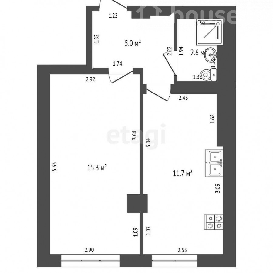 34.6 м2, турак жай: 15.3 м2