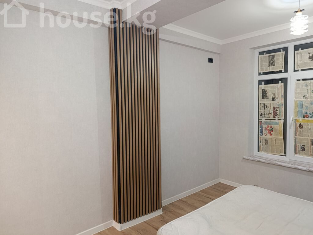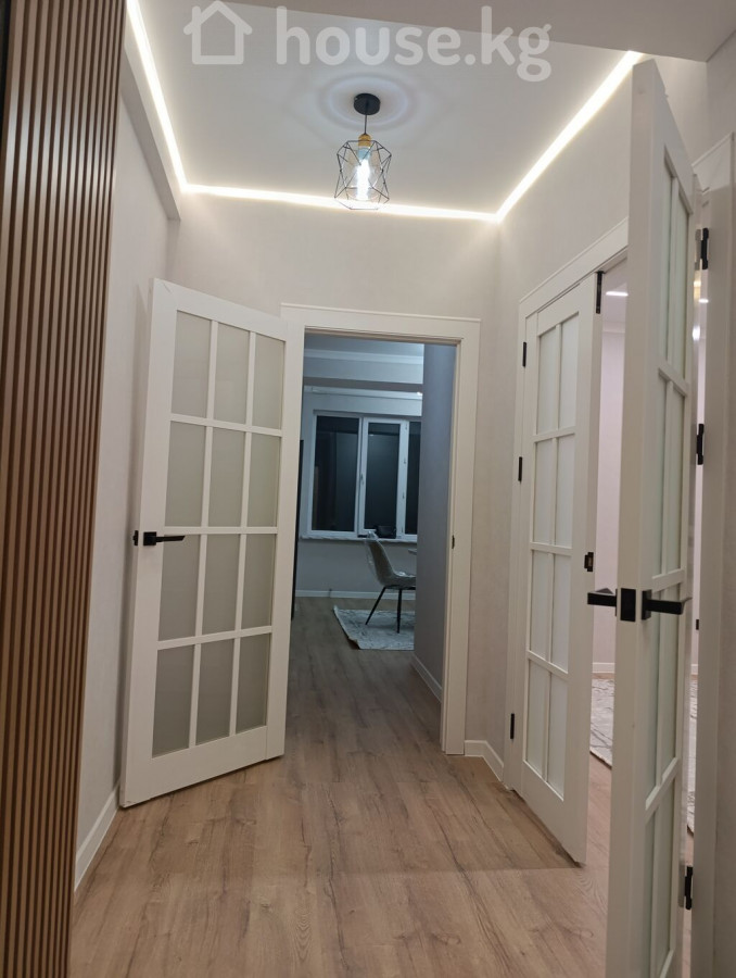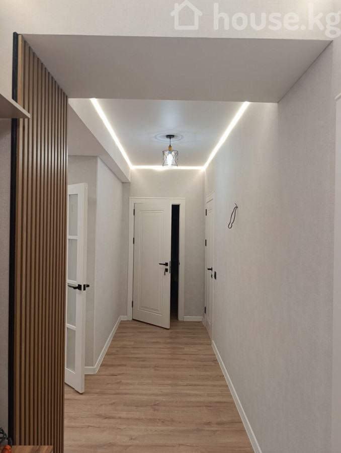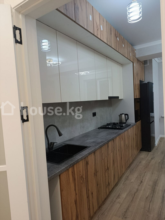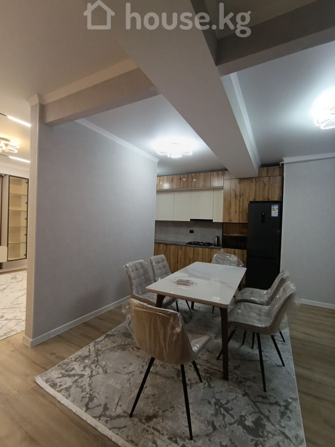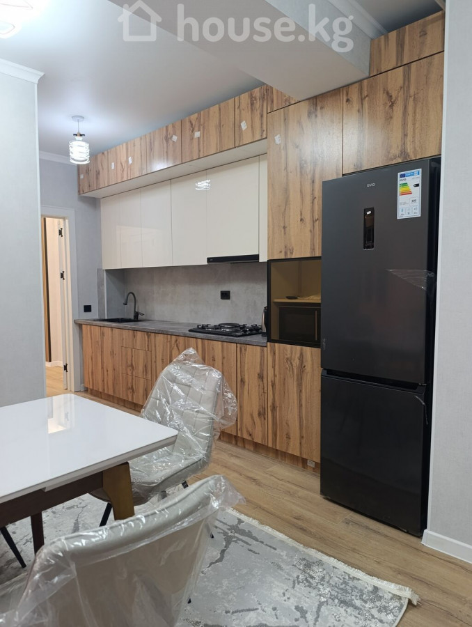 Современная квартира в новом жилом комплексе - Дом монолитный, высотный, с фасадом в серо-белых тонах, закрытым двором и подъездами на уровне благоустроенной территории. - Просторный двор с парковочными местами, пешеходными дорожками и навесом у входной группы. - Большие пластиковые окна, панорамное остекление эркеров на фасаде — много естественного света. - Квартира с отделкой светлых тонов: стены выровнены и окрашены, на полу — качественный ламинат под дерево. - Потолок с современным светильником, аккуратные плинтусы, выводы под радиаторы и инженерные коммуникации. - Кухонная зона с новой мебелью в отделке под дерево и темной столешницей; предусмотрены места под варочную панель, духовку и вытяжку. - Вид из окон на открытое пространство и зелёную зону. - В доме установлены видеокамеры на фасадах, предусмотрены балкончики с ограждениями на части окон, современные входные группы с витражным остеклением. Площадь: 70м² ЖК Ала-Тоо Бекзат