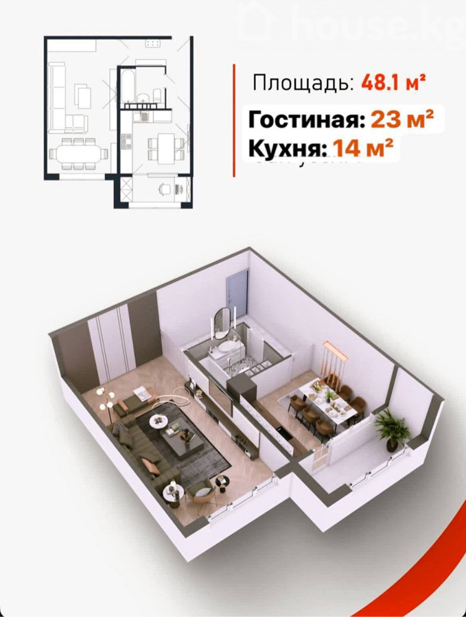 1-бөлм. бат., 48 м2