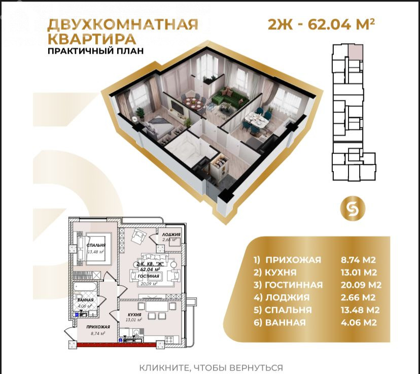 2-бөлм. бат., 62 м2, 8 кабат / 20