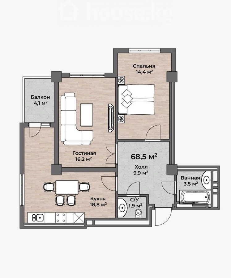 68.5 м2, ашкана: 19 м2