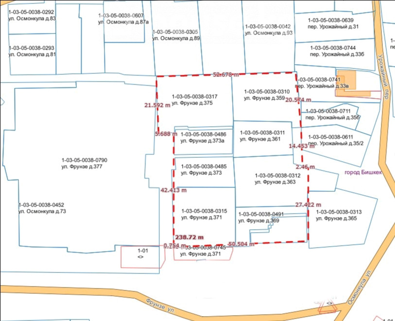 Продается участок в центре города, на первой линии со всеми коммуникациями на пересечении ул. Фрунзе / ул. Осмонкула 5,16 сот можно под бизнес, а также есть возможность выкупить соседние участки и получить площадь от 31 сотки и больше под строительство многоэтажного жилого дома (соседи также продают свои участки, цена договорная), все документы в порядке, у всех соседей есть красная книга. Удобное расположение в самом центре города, рядом мечеть Махмуда Кашгари, ЦУМ, ГУМ, Бишкек Сити, 1000 Мелочей, школы По генплану в этом районе разрешено строительство многоэтажного жилого дома.
