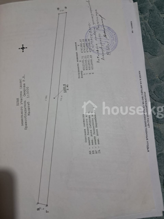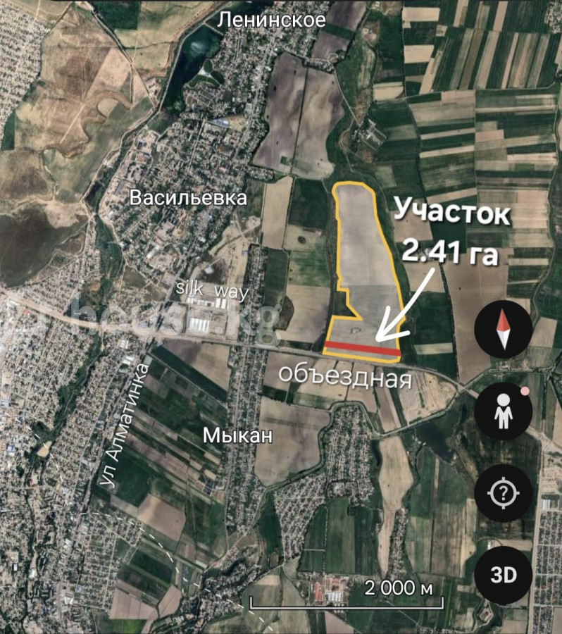 Продаётся земельный участок 2.41 гектара (241 соток), зеленая книга частная собственность (не аренда), сельскохозяйственное назначение, орошаемая пашня. Местоположение участка в районе рынка Дордой и Silk Way , в 60 метрах от Объездной дороги и недалеко от улицы Алматинской. Отличный вариант для инвестиций, перспективный район, также участок подходит под сельскохозяйственное производство, под строительство складов, СВХ, организации производства, под строительство ИЖС и многоэтажных домов. Размеры участка 33метра х 770 метра. Цена за 2.41 гектара 120 000$
