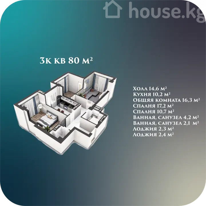 3-бөлм. бат., 80 м2